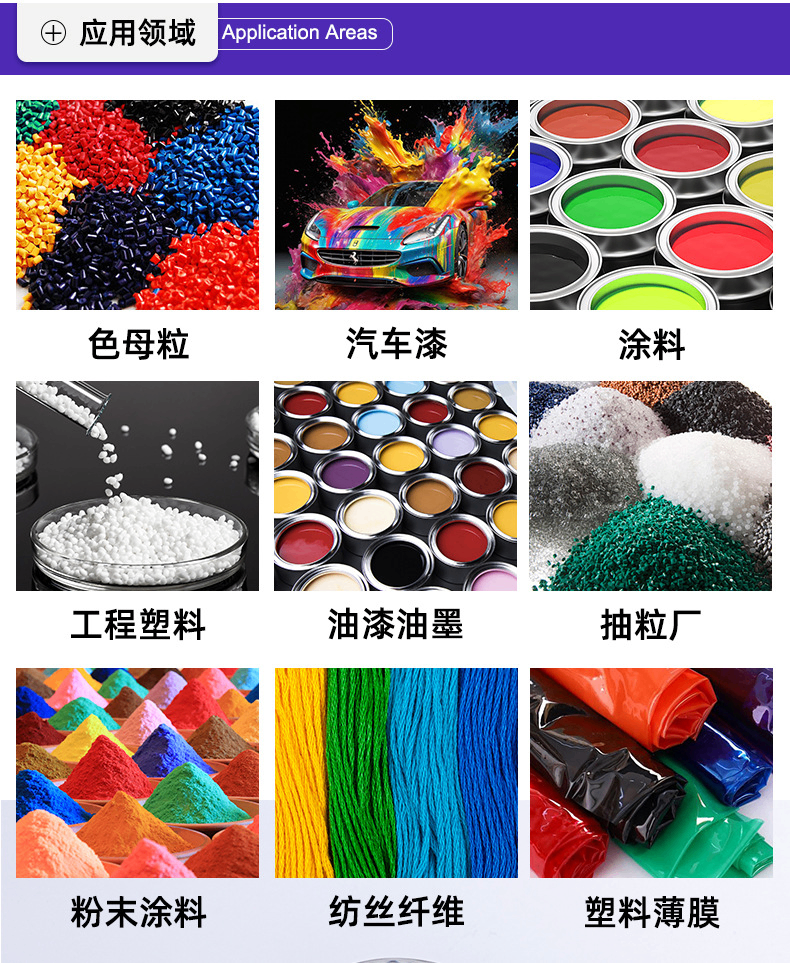 • 它适用于PP纤维,包装和玩具应用,是二芳基化合物和铬酸铅颜料的理想替代品。