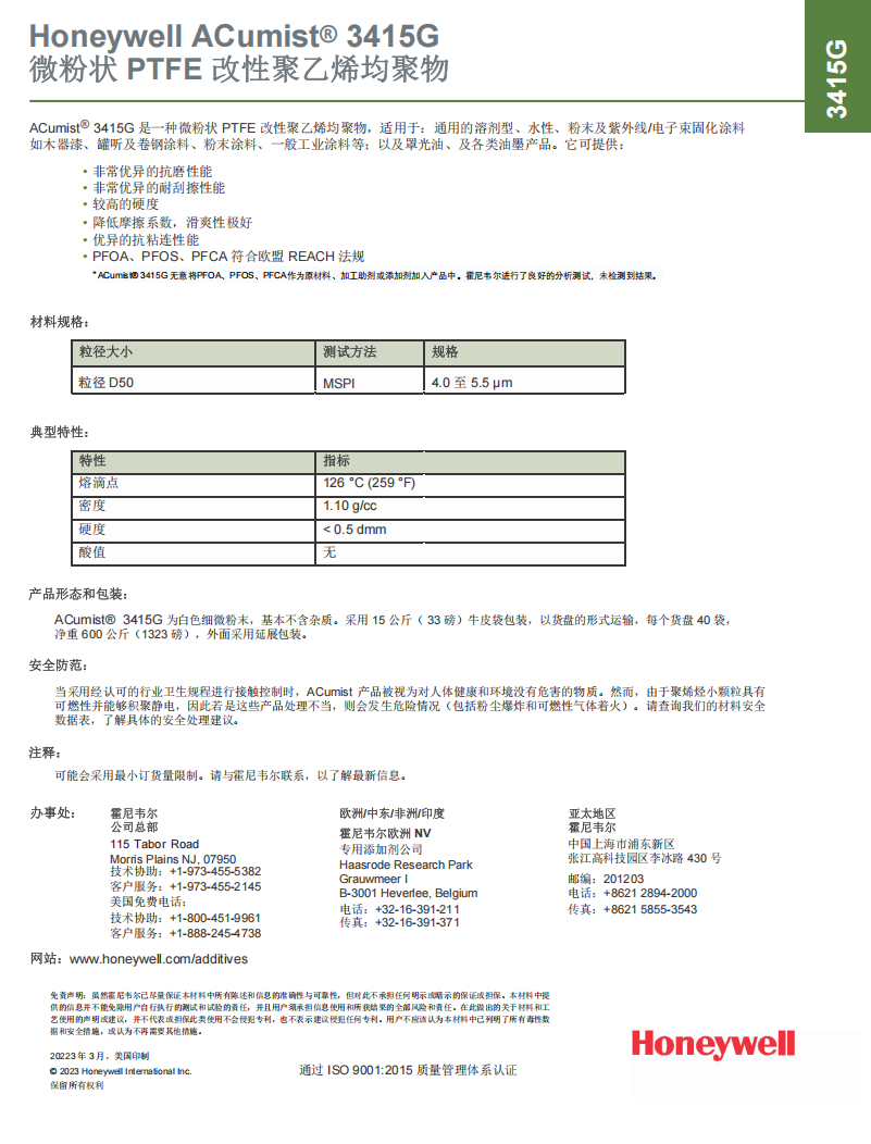 ACumist® 3415G 是一种微粉状 PTFE 改性聚乙烯均聚物,适用于:通用的溶剂型、水性、粉末及紫外线/电子束固化涂料 如木器漆、罐听及卷钢涂料、粉末涂料、一般工业涂料等;以及罩光油、及各类油墨产品。它可提供: • 非常优异的抗磨性能 • 非常优异的耐刮擦性能 • 较高的硬度 • 降低摩擦系数,滑爽性极好 • 优异的抗粘连性能 • PFOA、PFOS、PFCA 符合欧盟 REACH 法规 * ACumist® 3415G 无意将PFOA、PFOS、PFCA作为原材料、加工助剂或添加剂加入产品中。霍尼韦尔进行了良好的分析测试,未检测到结果。