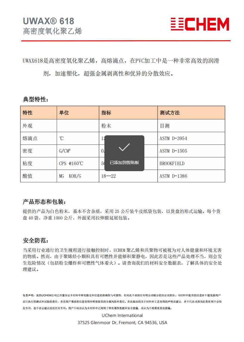 UWAX 618是高密度的氧化聚乙烯蜡,具有低粘度、高酸值的氧化聚乙烯蜡,加速塑化,突出的金属剥离性以及很好的分散效应。